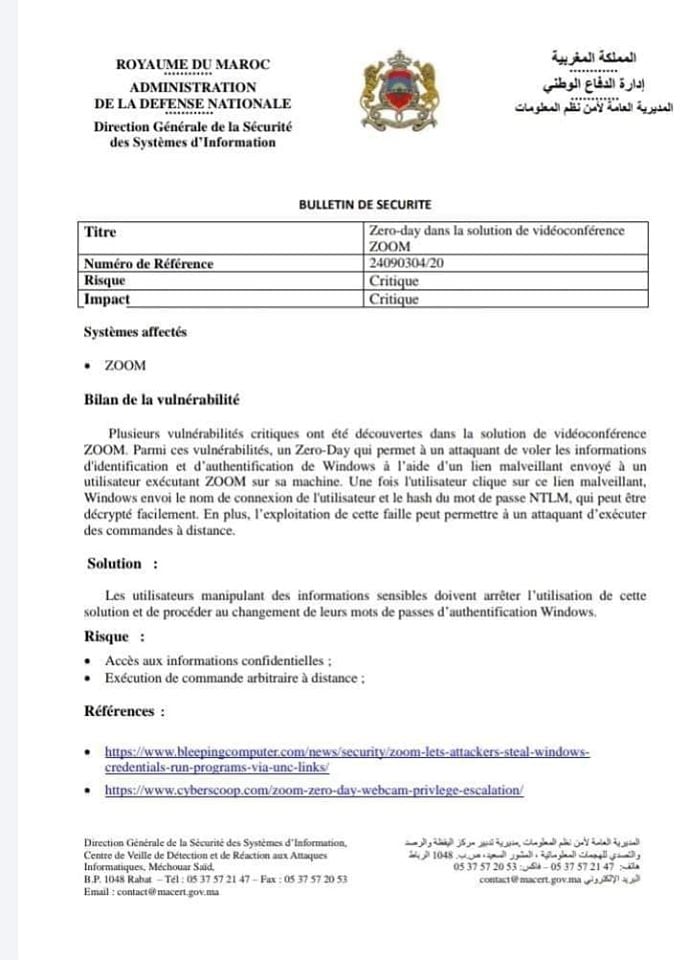 وفي هذا الصدد أصدرت المديرية العامة لأمن نظم المعلومات، بلاغا، تحذر فيه من استعمال تطبيق "زووم"، في المحادثات المرئية، وذلك بسبب هشاشة نظامه الأمني.