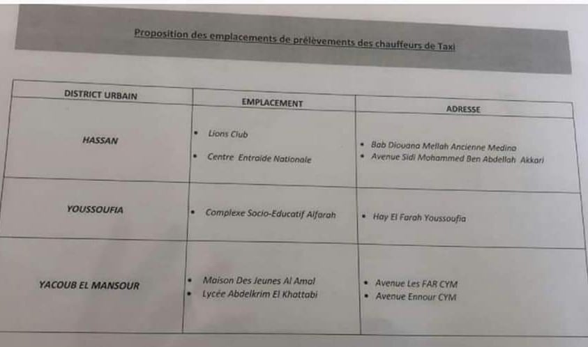 مصادر مؤكدة قالت أن والي الجهة السيد اليعقوبي، وقف بنفسه على هذا الإجراء الإلزامي، بتخصيص ثلاثة مراكز (الوثيقة) لاستقبال سائقي سيارات الأجرة، من أجل إخضاعهم لتحاليل مخبرية، الغرض منها، التأكد من عدم إصابة أي سائق قبل الشروع في نقل المواطنين.