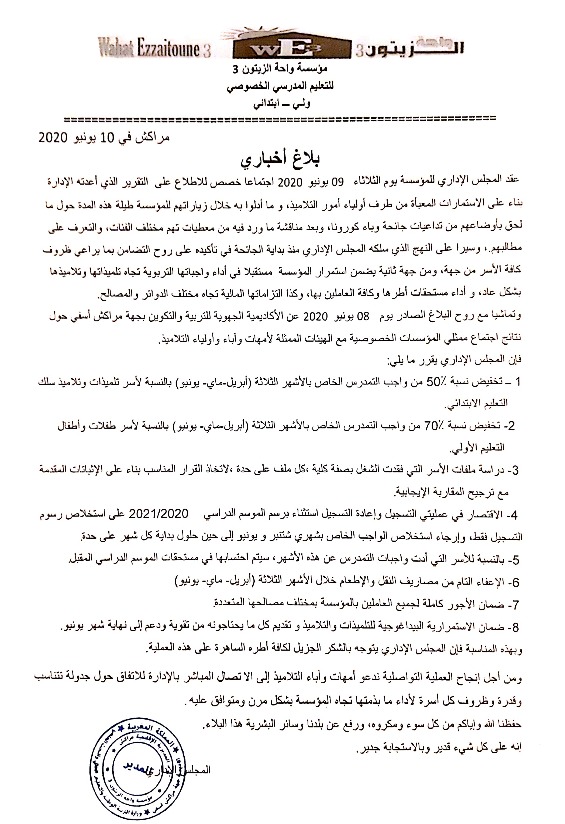 مباشرة بعد صدور البلاغ الجهوي المشترك للقاء الذي تم عقده يوم الإثنين 8 يونيو 2020 تحت اشراف مدير الاكاديمية الجهوية للتربية والتكوين بجهة مراكش آسفي، بين ممثلي المدارس الخصوصية وممثلي أمهات وآباء التلاميذ، انعقد اجتماع بين الإدارة التربوية لمؤسسة واحة الزيتون 2 الخصوصية وجمعية أمهات وآباء وأولياء أمور تلميذات وتلاميذ المؤسسة، بتاريخ 9 يونيو 2020 وذلك لتدارس الإجراءات العملية الكفيلة بتجاوز المشاكل المطروحة، والعمل على تدبير هذه المرحلة بما يخدم مصلحة التلميذ في المقام الأول، وذلك بتأمين مناخ تربوي خال من كل توتر مفتعل.