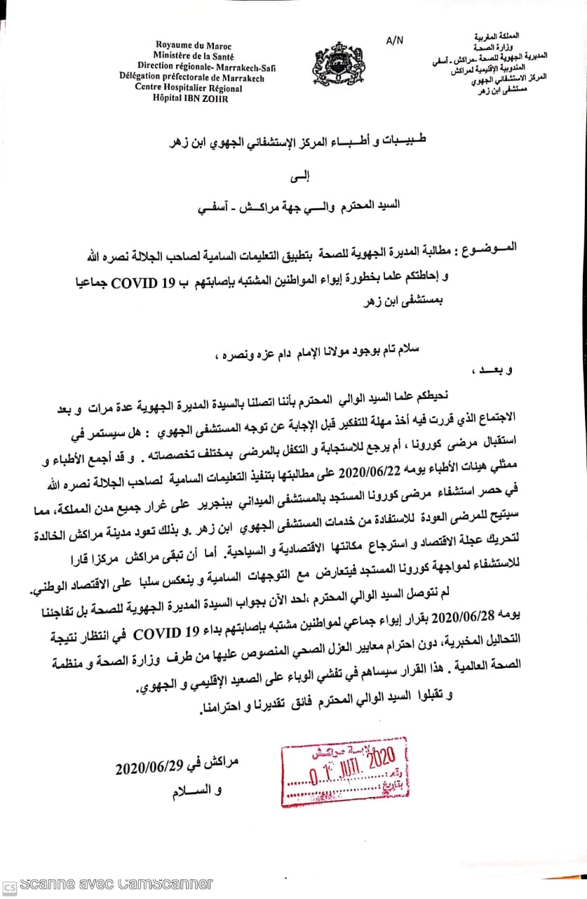 أطباء ابن زهر راسلوا المديرة الجهوية للصحة، وبعدها السيد والي جهة مراكش آسفي، والذين أكدوا في رسالتهم له، بأنهم اتصلوا بالمسؤولة الجهوية للقطاع عدة مرات بعد الإجتماع الذي قررت فيه أخذ مهلة للتفكير والتقرير بشأن توجه المستشفى الجهوي: هل سيستمر في استقبال مرضى كورونا أم يرجع للتكفل بمرضى مختلف التخصصات؟