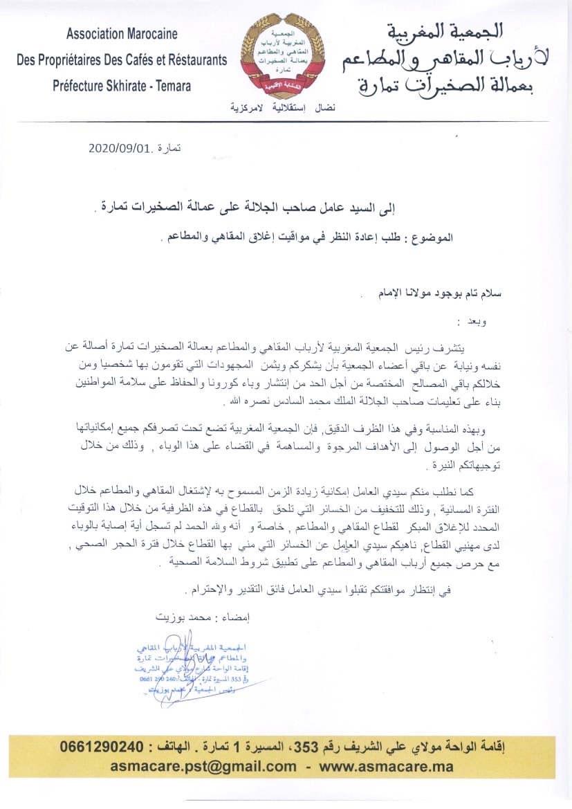 على إثر القرار العاملي الذي صدر قبل أسابيع، والقاضي بإغلاق المقاهي والمطاعم عند الساعة التاسعة من مساء كل يوم، وبسبب الخسائر المالية الكبيرة التي تكبدها هذا القطاع، بادرت الجمعية المغربية لأرباب المقاهي والمطاعم بعمالة الصخيرات-تمارة، إلى مراسلة عامل الإقليم، حيث التمست منه تعديل مواقيت الإغلاق، وتمديد زمن عمل هذه المحلات خلال الفترة المسائية، وذلك للتخفيف من حجم الخسائر المادية التي تكبدها هذا القطاع منذ بداية الجائحة.