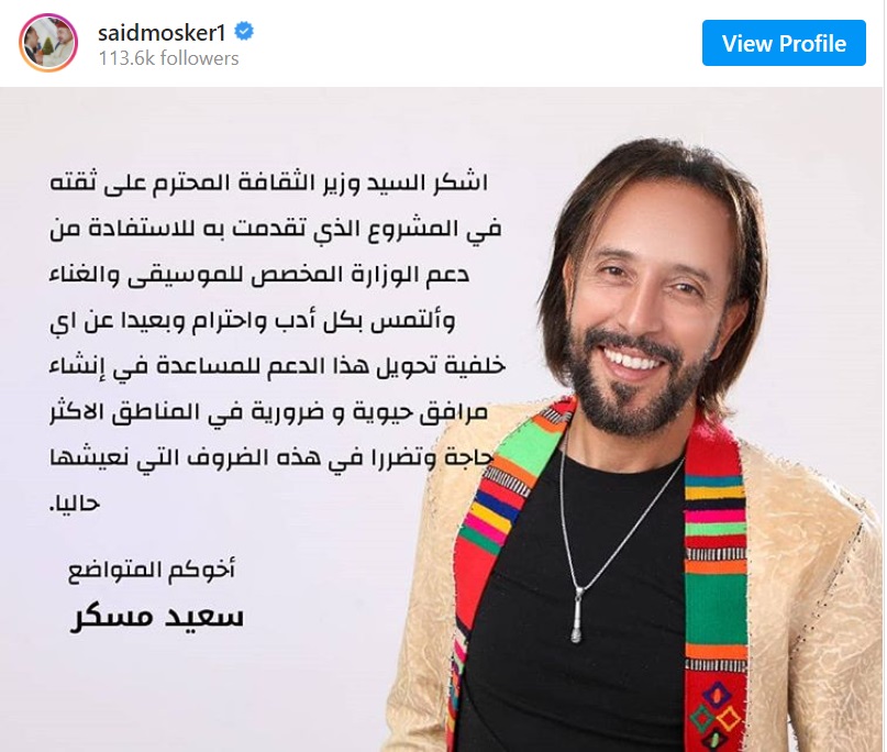 الفنان سعيد مسكر قرر كذلك التنازل عن الدعم الفني الممنوح له برسم سنة 2020، حيث قال في منشور على صفحته على الانستغرام، :"أشكر السيد وزير الثقافة المحترم على ثقته في المشروع الذي تقدمت به للاستفادة من الدعم المخصص للموسيقى والغناء. "