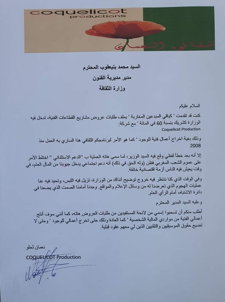 وأفاد "لحلو" في رسالته أن وزير الثقافة أخطأ في إضافة كلمة "استثنائي" لتسمية الدعم الذي استفاد منه مجموعة من الفنانين، والتي أساء فهمها الرأي العام المغربي ظنا منه أنه دعم اجتماعي.