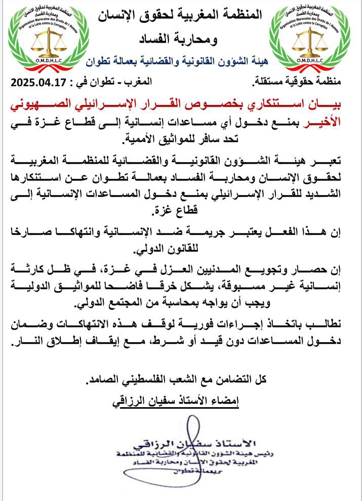 عبرت هيئة الشؤون القانونية والقضائية للمنظمة المغربية لحقوق الإنسان ومحاربة الفساد بعمالة تطوان، عن استنكارها الشديد للقرار الصهيوني الأخير القاضي بمنع دخول أي مساعدات إنسانية إلى قطاع غزة، معتبرةً أن هذا الفعل يشكل "جريمة ضد الإنسانية" و"انتهاكا صارخا للقانون الدولي والمواثيق الأممية.