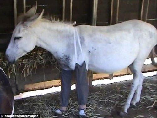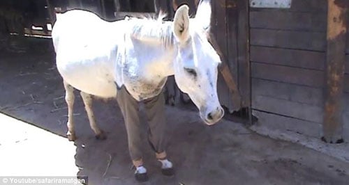 قد يبدو هذا المخلوق غريبا وهو يرتدي هذا السروال ولكنه أنقذ قدمه بعد فترة علاج طويلة. كان ملاك الحمار "هييم" قد أسائوا استخدامه بعد تقييده بالأسلاك الشائكة والسماح للأطفال المحليين بالاعتداء عليه. وقد تم انقاذ هذا الحيوان في النهاية وإرساله إلى ملجأ للحيوانات في منطقة الشرق الأوسط. وبدأ القائمون على رعايته في ملجأ رمات غان بالبدأ في برنامج طويل لمساعدته في التغلب على هذه الجراح المريبة. كما أنهم آثروا ارتدائه لهذا البنطلون لمنع الذباب من النخر في الجروح المفتوحة ومنعه أيضا من لعقها أو خدشها حتى يتماثل للشفاء وحتى لا تتفاقم الإصابات.