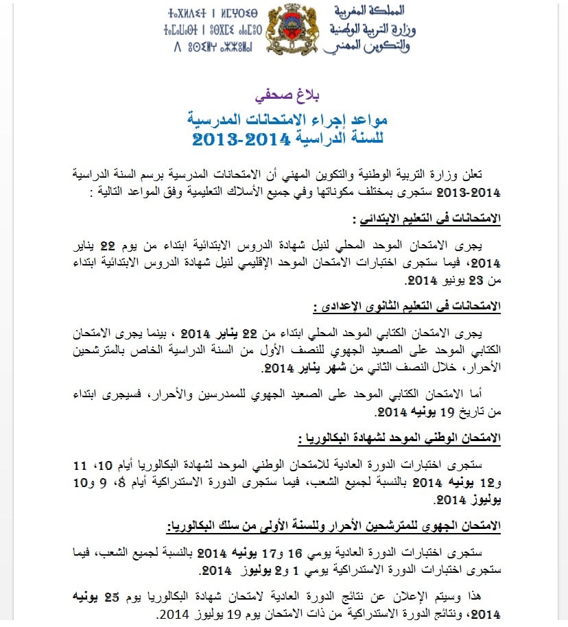 "تعلن وزارة التربية الوطنية والتكوين المهني أن الامتحانات المدرسية برسم السنة الدراسية 2014-2013 ستجرى بمختلف مكوناتها وفي جميع الأسلاك التعليمية وفق المواعد التالية :