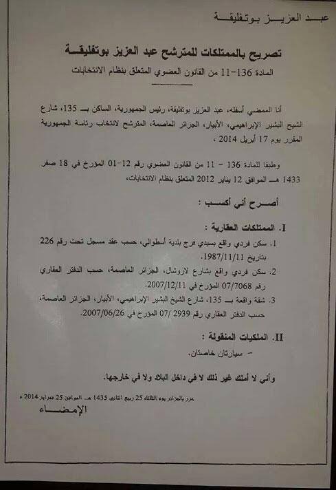 وجاء في آخر الوثيقة المؤرخة بتاريخ 25 فبراير 2014 ، أنّ « بوتفليقة » لا يتملك أي ممتلكات أخرى غير التي وردت سابقا.