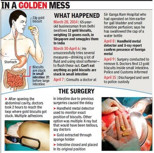 وأفادت صحيفة "نيويورك تايمز أوف إنديا" أن رجل الأعمال، يبلغ 63 عاماً، ابتلع القطع التي يبلغ وزنها 33 جراماً والمعروفة باسم "بسكويت الذهب" في سنغافورة وحضر بهم إلى الهند في الثامن والعشرين من الشهر الماضي.
