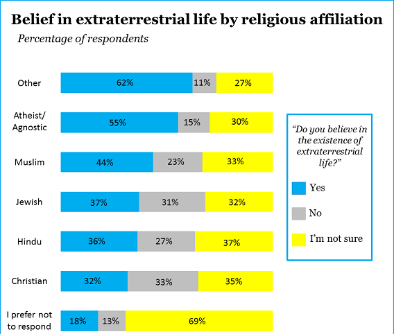 زعم أستاذ علم الفلك من جامعة فاندربيلت في ناشفيل بولاية تينيسي أن المسلمين يأتون في المرتبة الثانية من ناحية الإيمان بالمخلوقات الفضائية بنسبة 44%، فيما يحتل الملحدون المرتبة الأولى بنسبة 55% و37% لليهود و32% بالنسبة للمسيحيين.