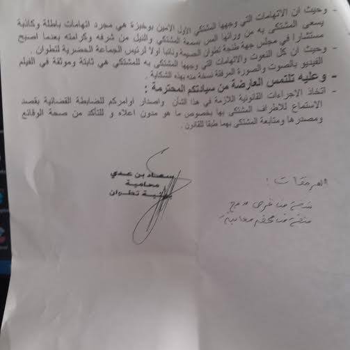 وضع دفاع النائب الأول لرئيس الجماعة الحضرية لتطوان السيد نورالدين هروشي زوال أمس الثلاثاء 10 نونبر الجاري ، شكاية لدى وكيل الملك لدى إبتدائية تطوان ، تحت رقم 5669 / 3101 / 2015 ، ضد كل من البرلماني الأسبق لمدينة تطوان السيد الأمين بوخبزة ، و الموقع الإلكتروني المحلي الذي نشر الشريط .
