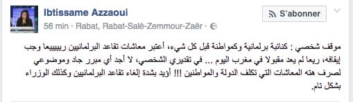 و كتبت البرلمانية في صفحتها على الفايسبوك :"موقف شخصي : كنائبة برلمانية وكمواطنة قبل كل شيء، أعتبر معاشات تقاعد البرلمانيين ريييييعا وجب وقفه، ريعا لم يعد مقبولا في مغرب اليوم … في تقديري الشخصي، لا أجد أي مبرر جاد وموضوعي لصرف هته المعاشات التي تكلف الدولة والمواطنين !!! أؤيد بشدة إلغاء تقاعد البرلمانيين بشكل تام".