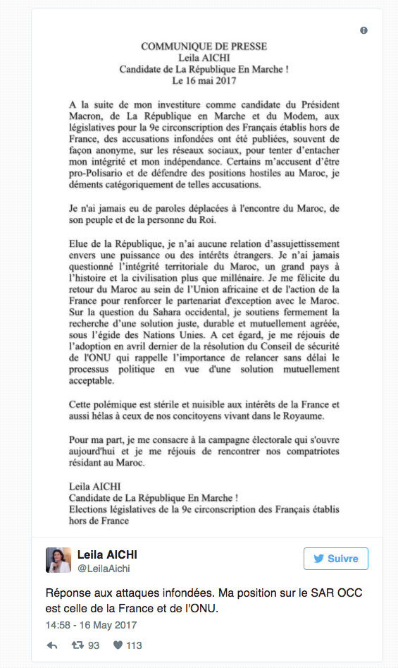 موقف المرشحة جاء عبر بيان نشرته على حسابها على تويتر بعد أيام من الجدل الذي أحدثه إعلان ترشحها للانتخابات التشريعية عن الدائرة التاسعة لفرنسيي الخارج والتي تضم 16 دولة بينها المغرب والجزائر وتونس.
