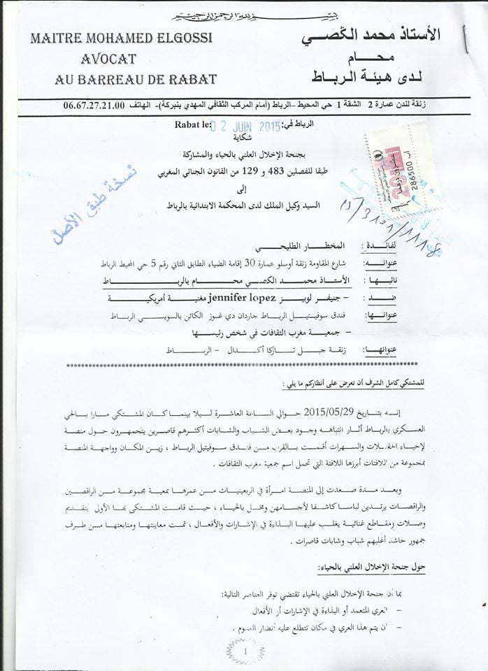 وصلت قضية سهرة المغنية الأمريكية، جنيفر لوبيز الى ردهات المحاكم المغربية ، بعدما قرر مواطن مغربي، يدعى المختار الطليحي، رفع دعوى قضائية لدى وكيل الملك بالمحكمة الابتدائية بالرباط، ضد المغنية الأمريكية.بتهمة "الإخلال العلني بالحياء" و المشاركة..