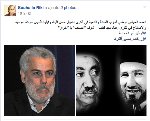 و جاء في تدوينة سهيلة الريكي :" انعقاد المجلس الوطني لحزب العدالة والتنمية في ذكرى اغتيال حسن البنا، وقبلها تأسيس حركة التوحيد والإصلاح في ذكرى إعدام سيد قطب… شوف " الصدف " يا " إخوان ".