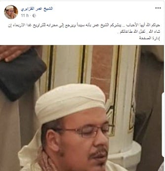 وقال القزابري في التدوينة التي نشرها:"حياكم الله أيها الأحباب .. يبشركم الشيخ عمر بأنه سيبدأ ويرجع إلى محرابه للتراويح غدا الاربعاء إن شاء الله . تقبل الله طاعاتكم ."