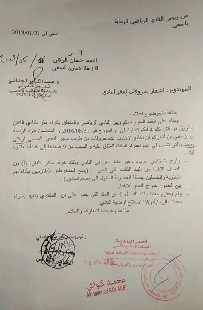 راسل رئيس النادي الرياضي للرماية بآسفي، عن طريق مفوض قضائي، مسير نادي الكائن بطريق مراكش كلم 4 الكارتينغ آسفي، بخصوص الخروقات التي عرفها النادي في مخالفة صريحة لبنود العقد الذي يجمعه بالنادي الرياضي بتاريخ 31 غشت 2016.