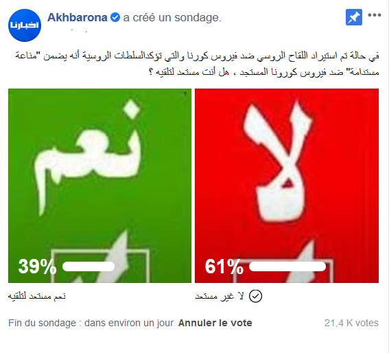 وفي استطلاع رأي قامت به صحيفة أخبارنا المغربية وشارك فيه أزيد من 20 ألف شخص، عبّر 39% من قراء الجريدة عن استعدادهم لتلقي فيروس كورونا في حالة استيراده من روسيا، حيث اشترط جل الموافقين على تلقي اللقاح، بأن يكون هذا الأخير قد تمت الموافقة عليه من طرف الصحة العالمية وصادقت عليه وزارة الصحة.