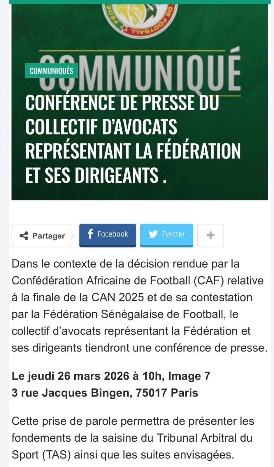 وقررت هيئة الدفاع المكلفة بالملف عقد ندوة صحافية يوم غد الخميس 26 مارس بالعاصمة الفرنسية باريس. الندوة التي ستنطلق في تمام الساعة العاشرة صباحاً، ستخصص لعرض الحجج والأسس القانونية التي يستند إليها الطعن السنغالي، بالإضافة إلى الكشف عن الخطوات الإجرائية والمساطر التي سيتم اتباعها في المرحلة المقبلة أمام المحكمة السويسرية.