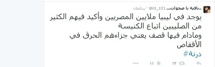 وقال الهنصر داعشي في تغريدته : "يوجد في ليبيا ملايين المصريين وأكيد فيهم الكثير من الصليبين أتباع الكنيسة، ومادام فيه قصف يعني جزاءهم الحرق في الأقفاص".