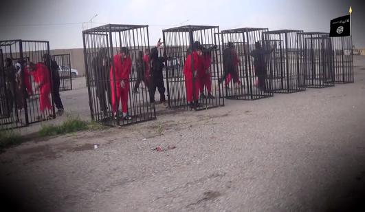 ويظهر الفيديو، عناصر من "داعش" وهم يقتادون 21 شخصا يرتدون زي الإعدام البرتقالي، قبل أن يظهر هؤلاء الأشخاص في أقفاص حديدية شبيهة بذلك الذي ظهر فيه الطيار الأردني معاذ الكساسبة، أوائل الشهر الجاري، قبل حرقه حيا.