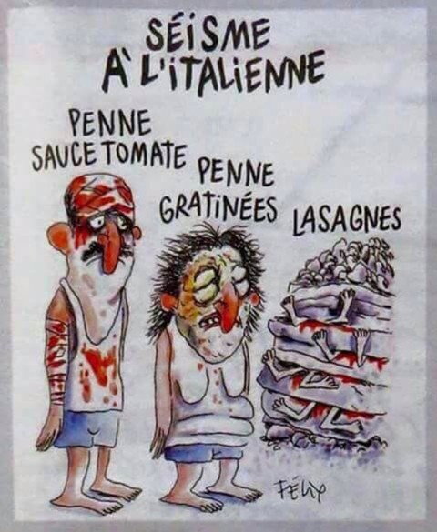 نشرت صحيفة “شارلي إيبدو” الفرنسية الساخرة في عددها الصادر، أمس الجمعة، رسما كاريكاتوريا لضحايا الزلزال الذي ضرب وسط إيطاليا مطلع الأسبوع الماضي، وأوقع حوالي 300 قتيل، الأمر الذي أثار موجة غضب واستنكار في إيطاليا وخارجها.