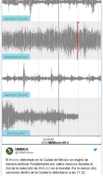 وأوضح المصدر أنه: "تم توثيق زلزال في مدينة مكسيكو، ويحمل طابعا عرضيا. وعلى الأرجح ، ذلك كان سببه قفزات مجموعات كبيرة خلال هدف فريق المكسيك في بطولة كأس العالم، رصدها اثنان على الأقل من أجهزة الاستشعار".