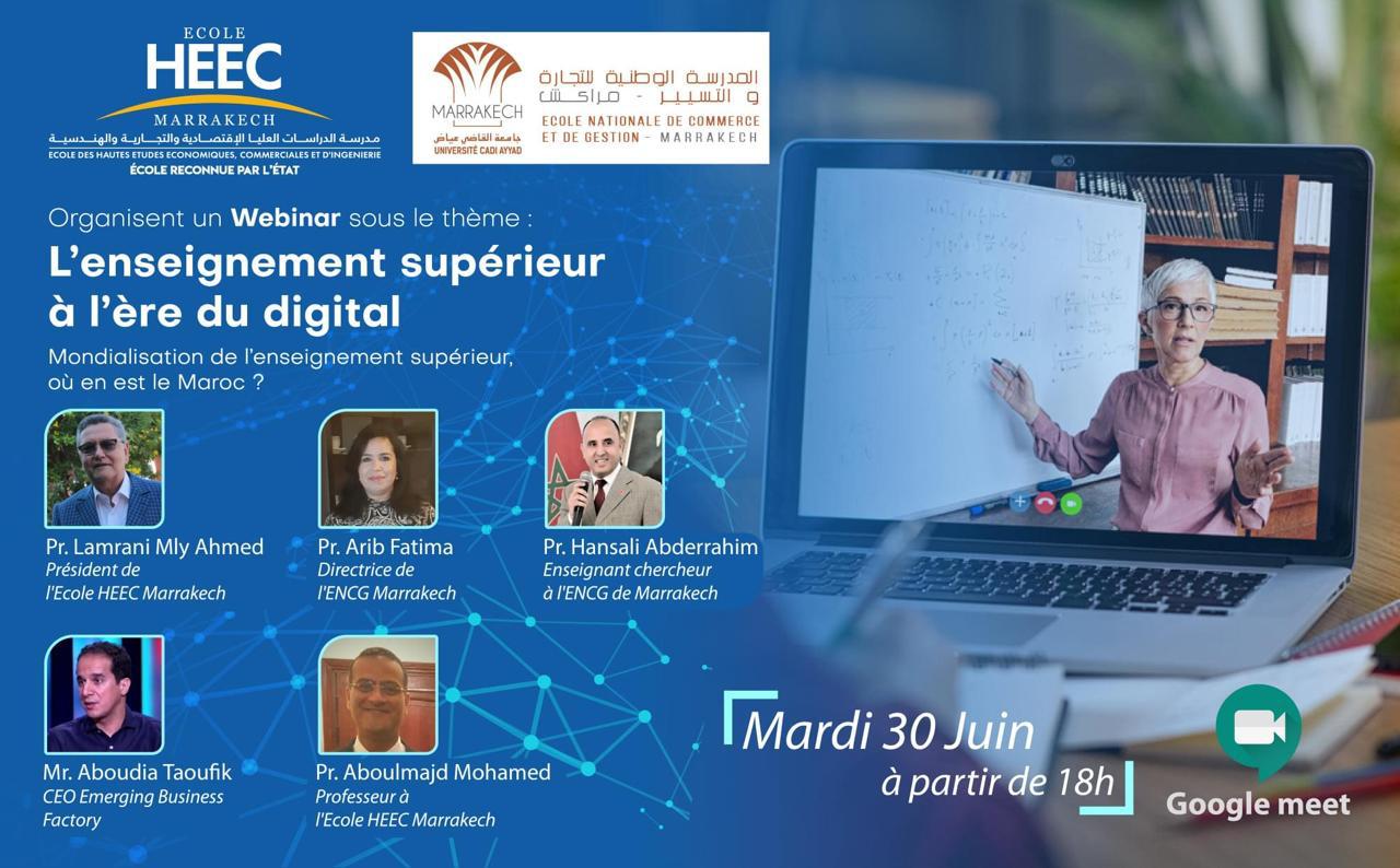 تنظم مدرسة الدراسات العليا الإقتصادية والتجارية والهندسية (HEEC) بمراكش والمدرسة الوطنية للتجارة والتسيير (ENCG) التابعة لجامعة القاضي عياض بمراكش نقاشا علميا عبر الويب في موضوع: "التعليم العالي في العصر الرقمي"، وسيتعرض النقاش حسب الوثائق التي اطلعت عليها أخبارنا لموضوع عولمة التعليم العالي، وأين نحن منه في المغرب؟