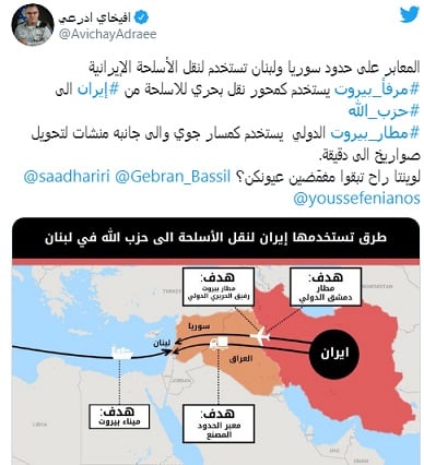 التغريدة التي تعود إلى شهر يوليوز من السنة الماضية قال فيها أفيخاي أدرعي أن مرفأ بيروت يستعمل أساسا لمد حزب الله بالأسلحة القادمة من إيران حسب تعبيره.