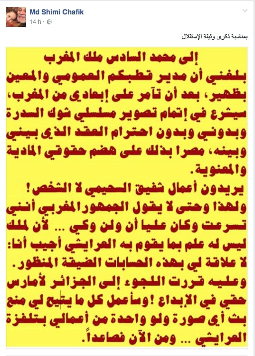 في تطور خطير جدا ، قرر شفيق السحيمي اللجوء إلى دولة الجزائر … هذا ما كتبه المخرج والممثل السينمائي المغربي على حسابه في الفيسبوك، على خلفية قضيته المعروفة ضد الرئيس المدير العام للشركة الوطنية للإذاعة والتلفزة،فيصل لعرايشي، و التي اتهم خلالها الأخير بالتلاعب في إنتاج مسلسله " شوك السدرة " ، تلاعبات تسببت أيضا في إيقاف جنرال بالدرك الملكي، قبل أن يعود هذا الجنرال إلى مزاولته مهامه بعد ذلك ، دون اية متابعة قضائية.