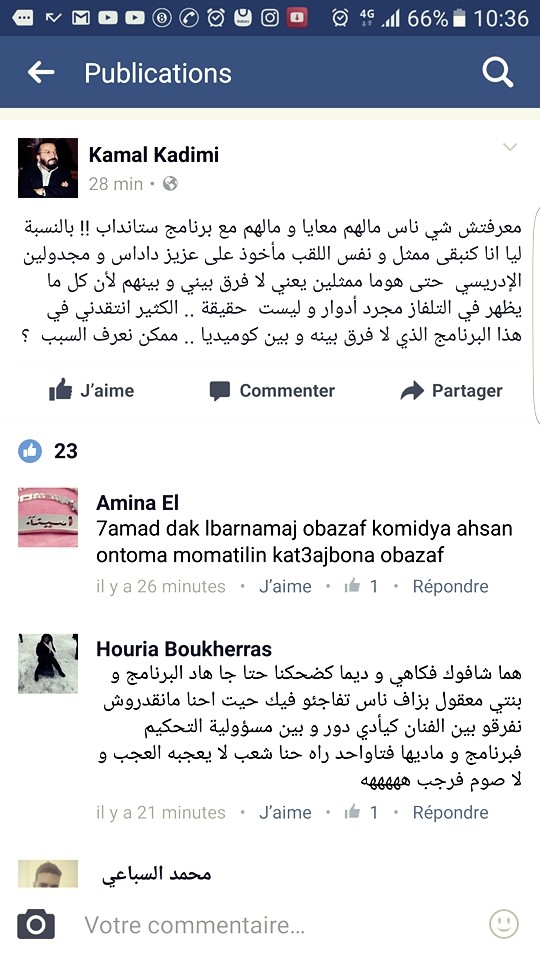 لا أحد يشكك في مستوى الممتل كمال كاضمي لكن البرنامج ككل مستواه متدني للغاية وخصوصا برنامج كوميديا لازال عالقا في أذهاننا كنا ننتظر يوم السبت لنستمتع ونضحك واعطنا عدد كبير من الكوميدين الدين هم اليوم محترفين ولهم مكانهم في الوسط الفني أما برنامج ستنداب كوميدي لا يستحق 2/20 وبعض الممثلين الدين ياطرون المشاركين لا علاقة لهم بالكوميديا
