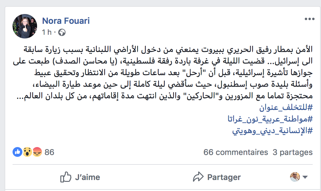 وفي تعليق لها على الحادث، نشرت الفواري، تدوينة عبر حسابها الخاص على الفيسبوك، جاء فيها :"الأمن بمطار رفيق الحريري ببيروت يمنعني من دخول الأراضي اللبنانية بسبب زيارة سابقة الى إسرائيل".