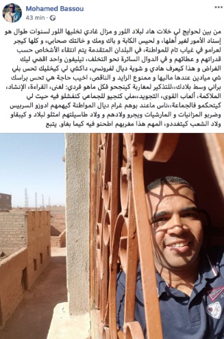 وتابع الكوميدي المتألق : " في البلدان المتقدمة يتم انتقاء الأشخاص حسب قدراتهم و عطائهم و في الدوال السائرة نحو التخلف، تيليفون واحد اقضي ليك الغراض و هذا كيعرف هادي و شوية ديال لفرونسي، داكشي لي كيخليك تحس بلي شي ميادين عندها ماليها و ممنوع الزايد و الناقص"، قبل أن يؤكد : "اخيب حاجة هي تحس براسك براني وسط بلادك، للتذكير لمغاربة كينجحو فكل ما هو فردي( لغنى، القراءة، الإنشاد، الملاكمة، ألعاب القوى، التجويد) ملي كنجيو للجماعي كنفشلو فيه حيت لي كيتحكمو فالجماعة ناس ماعند بوهم غرام ديال المواطنة كيهمهم ادوزو السربيس وضربو الميزانيات و المارشيات ويجرو ولادهم و ولاد طاسيلتهم امثلو لبلاد و كيبقاو ولاد الشعب كيتغددو، المهم هذا مغربهم اطحنو فيه كيما بغاو".