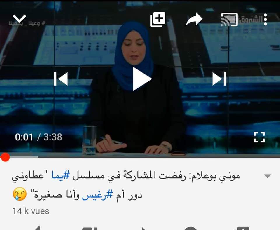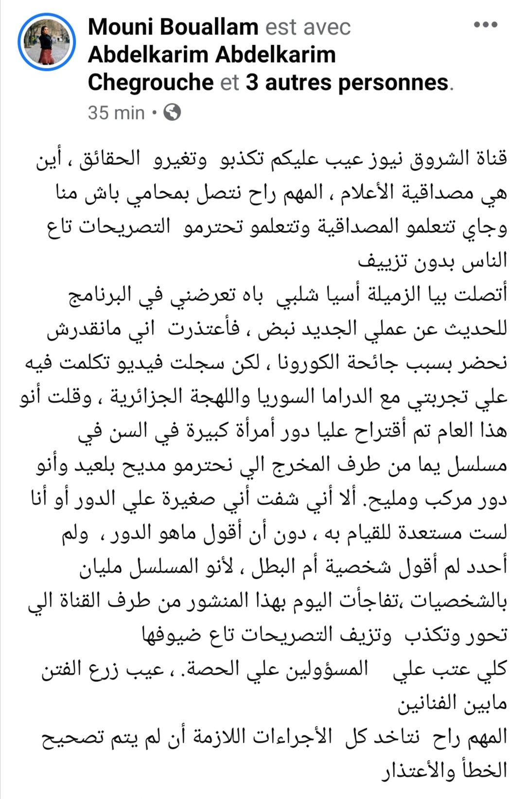 وجاء في تدوينة الفنانة" موني بوعلام" التي تقمصت خلال رمضان الحالي دور البطولة في مسلسل سوري بعنوان" نبض": "عيب عليكم تكذبو وتغيرو الحقائق، أين هي مصداقية الأعلام ، المهم راح نتصل بمحامي باش منا وجاي تتعلمو المصداقية وتتعلمو تحترمو التصريحات تاع الناس بدون تزييف"، وتابعت ذات المتحدثة قائلة: "اتصلت بيا الزميلة أسيا شلبي باه تعرضني في البرنامج للحديث عن عملي الجديد نبض، فاعتذرت، لأني مانقدرش نحضر بسبب جائحة الكورونا، لكن سجلت فيديو تكلمت فيه على تجربتي مع الدراما السورية واللهجة الجزائرية، وقلت أنو هذا العام اقترح علي دور امرأة كبيرة في السن في مسلسل يما من طرف المخرج الي نحترمو مديح بلعيد وأنو دور مركب ومليح. إلا أني شفت أني صغيرة على الدور أو أنا لست مستعدة للقيام به، دون أن أقول ماهو الدور ، ولم أحدد ولم أقل شخصية أم البطل، لأن المسلسل مليان بالشخصيات، وتفاجأت اليوم بهذا المنشور من طرف القناة الي تحور وتكذب وتزيف التصريحات تاع ضيوفها".