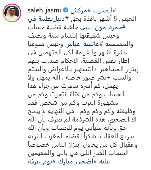 وتابع الإعلامي الإماراتي في نفس التدوينة :"الاحكام صدرت بتهم إبتزاز المشاهير +التشهير بالاعراض والشتم والسب +نشر صور خاصه ، الله يمهل ولا يهمل، كم أسرة تدمرت من جراء هذا الحساب وكم من فتاة انتحرت وكم من مشهورة ابتزت وكم من شخص فقد وظيفته وكم وكم وكم ، في النهاية لا يصح الا الصحيح".