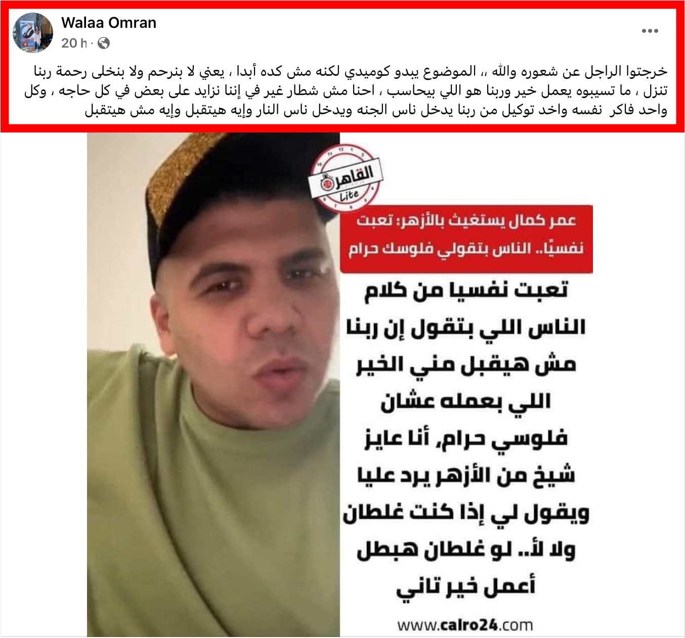 من جانبها، تفاعلت الإعلامية المصرية "ولاء عمران" مع الموضوع، حيث نشرت بالمناسبة، تدوينة عبر حسابها الفيسبوكي الخاص، جاء فيها: "خرجتوا الراجل عن شعوره والله، الموضوع يبدو كوميدي لكنه مش كده أبدا"، وتابعت: "يعني لا بنرحم ولا بنخلى رحمة ربنا تنزل، ما تسيبوه يعمل خير وربنا هو اللي بيحاسب، احنا مش شطار غير في إننا نزايد على بعض في كل حاجه، وكل واحد فاكر نفسه واخذ توكيل من ربنا يدخل ناس الجنة و يدخل ناس النار وإيه هيتقبل وإيه مش هيتقبل".