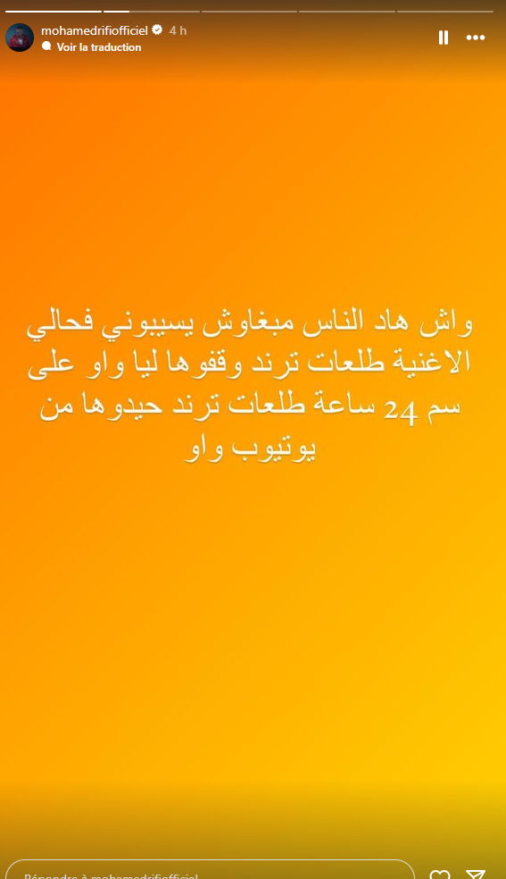 وأشار إلى أنه لم يفهم سبب هذا الحذف، مضيفا "واش هاد الناس مبغاوش يسيبوني فحالي الأغنية طلعات ترند وقفوها ليا، واو على سم 24 ساعة طلعات ترند حيدوها من يوتيوب واو".