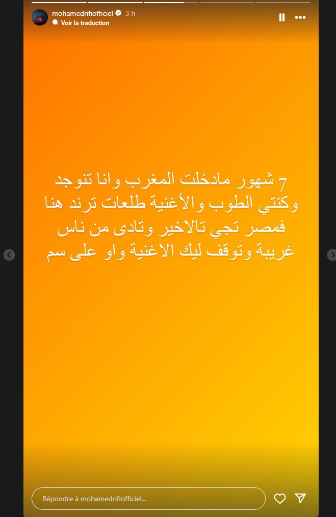 نشر الفنان محمد ريفي عبر حسابه الرسمي على إنستغرام، ستوري يعبر فيها عن استيائه الكبير بسبب حذف أغنيته الجديدة "جامدين جامدين" من قناته الخاصة على يوتيوب.