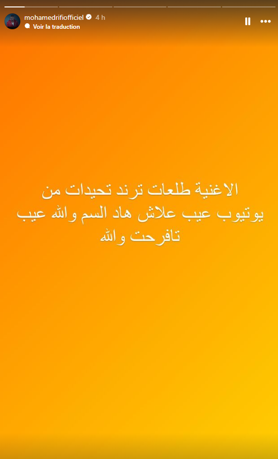وكتب ريفي: "الأغنية طلعات ترند تحيدات من يوتيوب..عيب علاش هاد السم والله عيب تافرحت والله".