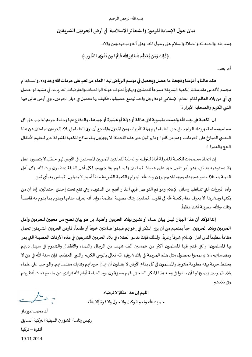 أصدر محمد غورماز الذي شغل سابقا منصب رئاسة الشؤون الدينية التركية، بيانا حول الإساءة للرموز والشعائر الإسلامية في أرض الحرمين الشريفين، معبرا عن تهوله وفزعه مما عرفته النسخة الحالية من فعاليات موسم الرياض، حيث وصف الأمر بأنه تعدًّ على حرمات الله وحدوده