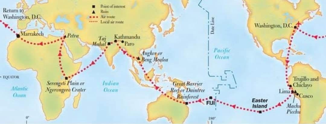 وانطلق برنامج الرحلة لهذا العام من العاصمة الأمريكية واشنطن، مرورا بسلسلة من المدن العالمية التي تمثل تنوعا مذهلا في الطبيعة والثقافة، شملت ليما في بيرو، بابييت في تاهيتي، ناديي في فيجي، كيرنز في أستراليا، سيام ريب في كمبوديا، كاتماندو في نيبال، وفرناسي أغرا وجايبور في الهند، وجبل كليمنجارو في تنزانيا، ومالطا، وصولا إلى مراكش في المملكة المغربية، قبل أن تختتم الرحلة في جزيرة سانتا ماريا البرتغالية.