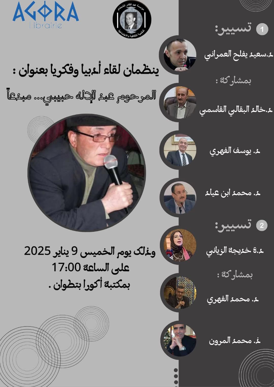 في إطار تعزيز الثقافة والإبداع الأدبي، نظمت مؤسسة عبد القادر الشمشام ومكتبة أكورا لقاءً أدبيًا وفكريًا تحت عنوان: "المرحوم عبد الإله حبيبي... مبدعًا"، بحضور ثلة من الأطر الجامعية والمبدعين في المجال الأدبي والفكري.
