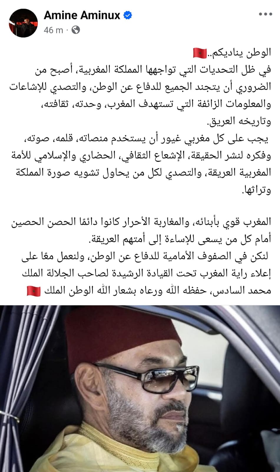 وأكد "أمينوكس" أن "المغرب قوي بأبنائه، والمغاربة الأحرار كانوا دائمًا الحصن الحصين أمام كل من يسعى للإساءة إلى أمتهم العريقة"، حيث قال في هذا الصدد: "لنكن في الصفوف الأمامية للدفاع عن الوطن، ولنعمل معًا على إعلاء راية المغرب تحت القيادة الرشيدة لصاحب الجلالة الملك محمد السادس، حفظه الله ورعاه بشعار الله الوطن الملك".