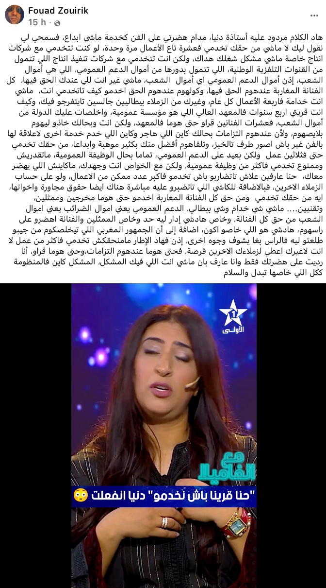 وتابع قائلا: "اضافة إلى أن الجمهور المغربي اللي تيخلصكم من جيبو طلعتو ليه فالراس، وبغا يشوف وجوه أخرى، إذن فهاد الإطار مامنحقكش تخدمي فأكثر من عمل لا انت ولا غيرك، اعطي لزملائك الآخرين فرصة، حتى هوما عندهوم التزامات، وحتى هوما قراو، أنا رديت على هضرتك فقط وانا عارف بان ماشي انت اللي فيك المشكل، المشكل كاين في المنظومة ككل اللي خاصها تبدل والسلام".