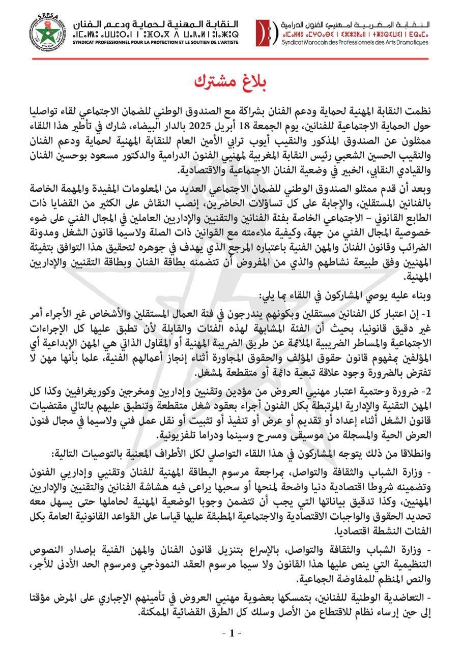 نظمت النقابة المهنية لحماية ودعم الفنان، بشراكة مع الصندوق الوطني للضمان الاجتماعي، لقاءً تواصليًا مع الفنانين يوم الجمعة 18 أبريل 2025 بمدينة الدار البيضاء، بهدف توضيح المستجدات المتعلقة بالحماية الاجتماعية للفنانين وتدارس الإشكالات المرتبطة بتنزيل القوانين ذات الصلة. وقد شارك في هذا اللقاء ممثلون عن الصندوق الوطني ومجموعة من الفاعلين النقابيين والفنيين، يتقدمهم المدير الجهوي للصندوق إدريس أو باري، والدكتور مسعود بوحسين، بصفته عضوا في المكتب الوطني للنقابة المغربية لمهنيي الفنون الدرامية.