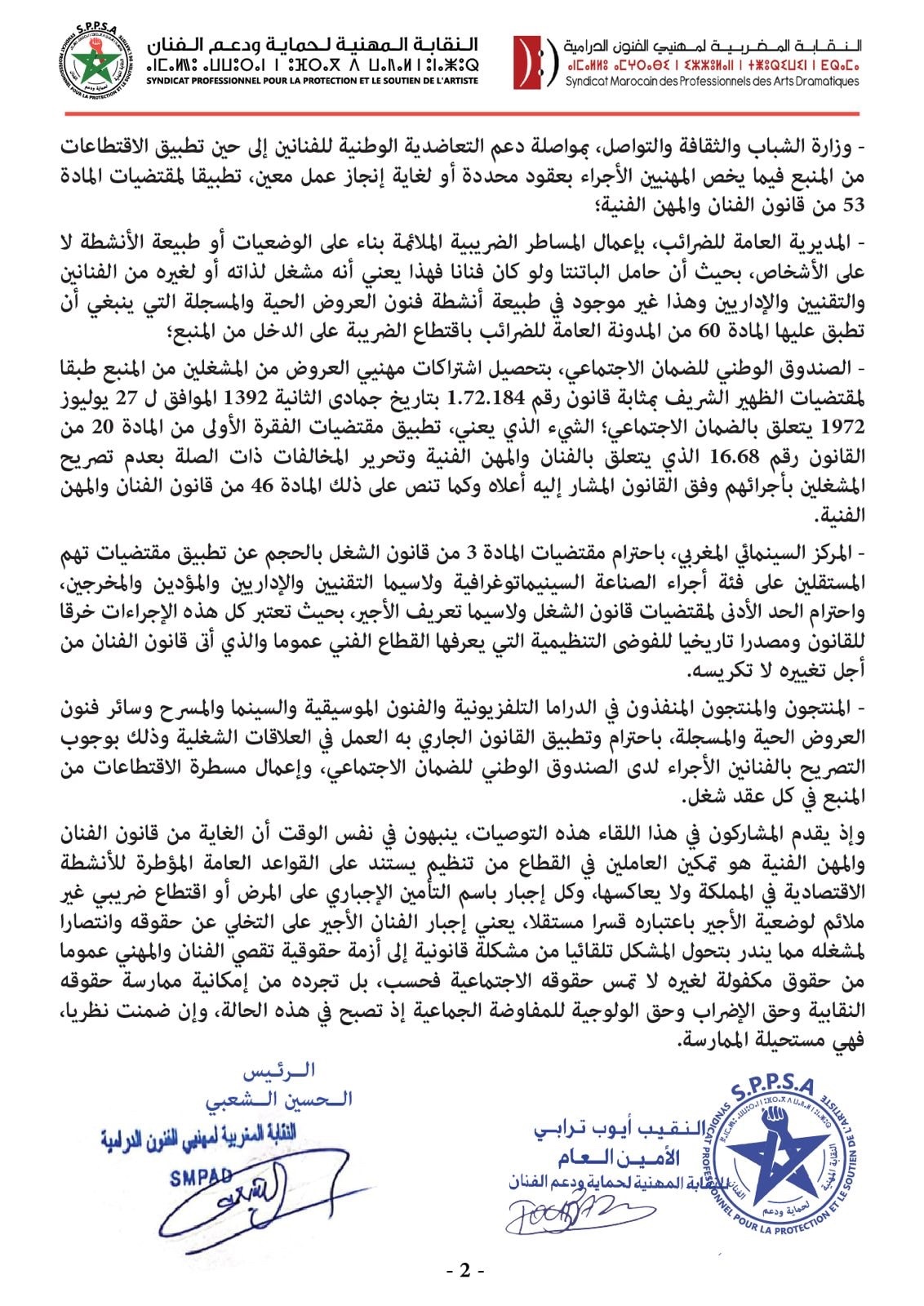 يجب أن يؤدوا الضرائب أولا....ثم واجبات الانخراط في التأمين الصحي والتقاعد منذ بداية مشوارهم الفني ...بعد ذلك يطالبوا بحقوقهم في التغطية الصحية والتقاعد كباقي المغاربة..