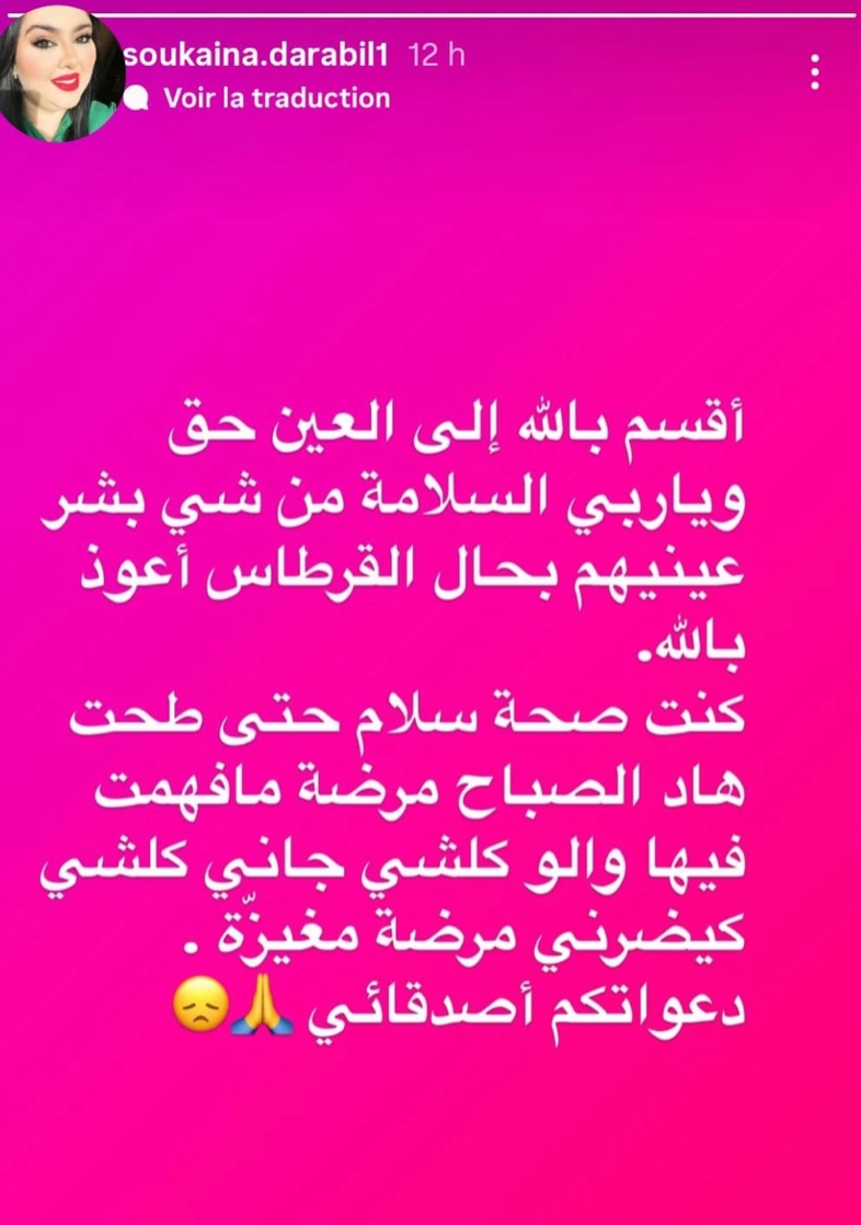 فاجأت الفنانة المغربية "سكينة درابيل" جمهورها العريض، بعد أن أعلنت عبر "ستوري" نشرته على حسابها الرسمي في منصة "إنستغرام"، عن تعرضها لوعكة صحية حادة أربكت استقرارها الجسدي، ودخلت على إثرها في حالة ألم شديد وغير معتادة.