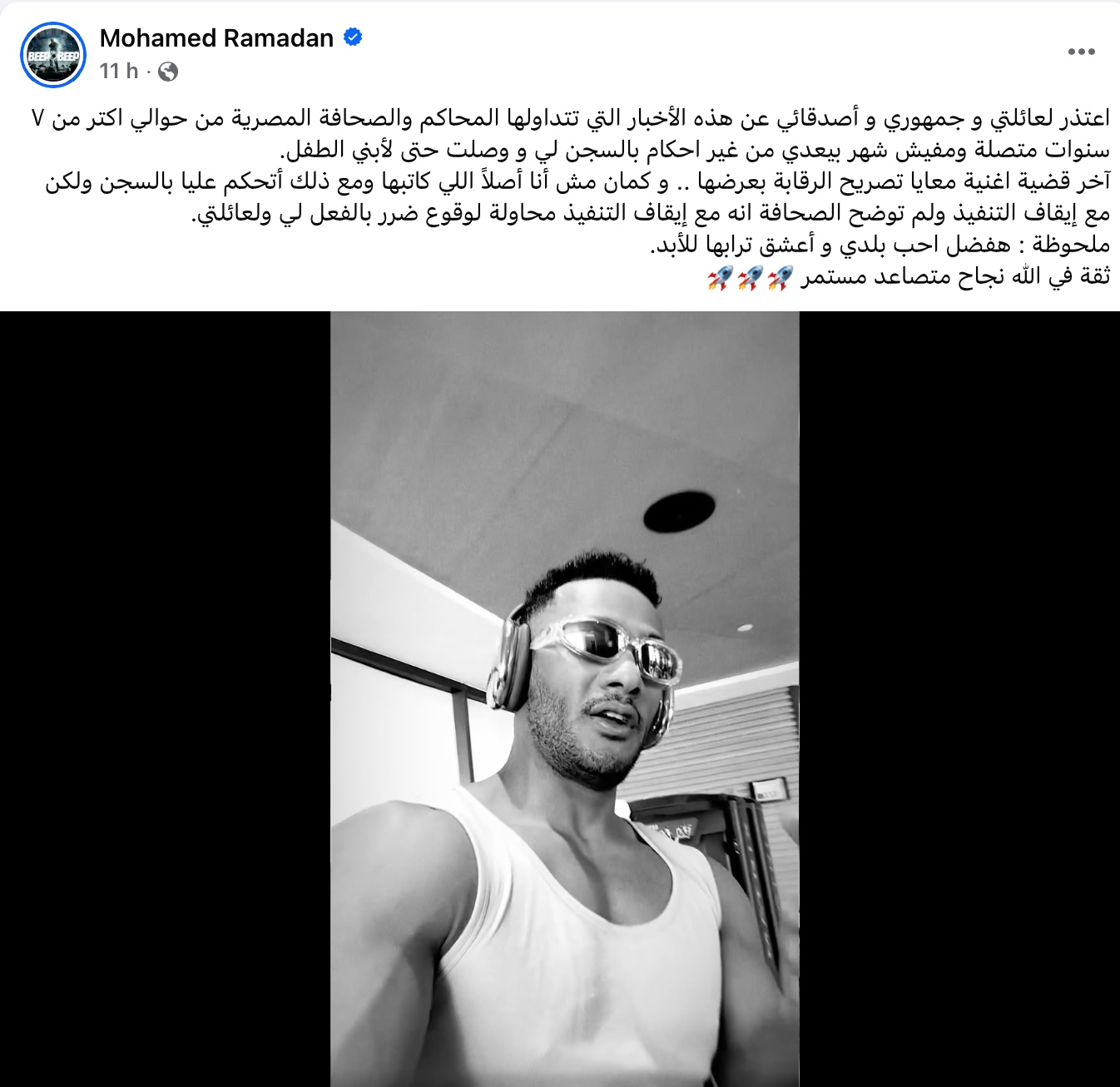 في سياق متصل، أعرب "رمضان" عن استيائه العميق من استمرار تداول مثل هذه الأخبار منذ أكثر من سبع سنوات، مؤكدًا أنه سيواصل نشاطه الفني وارتباطه بجمهوره وعائلته رغم كل التحديات القانونية.