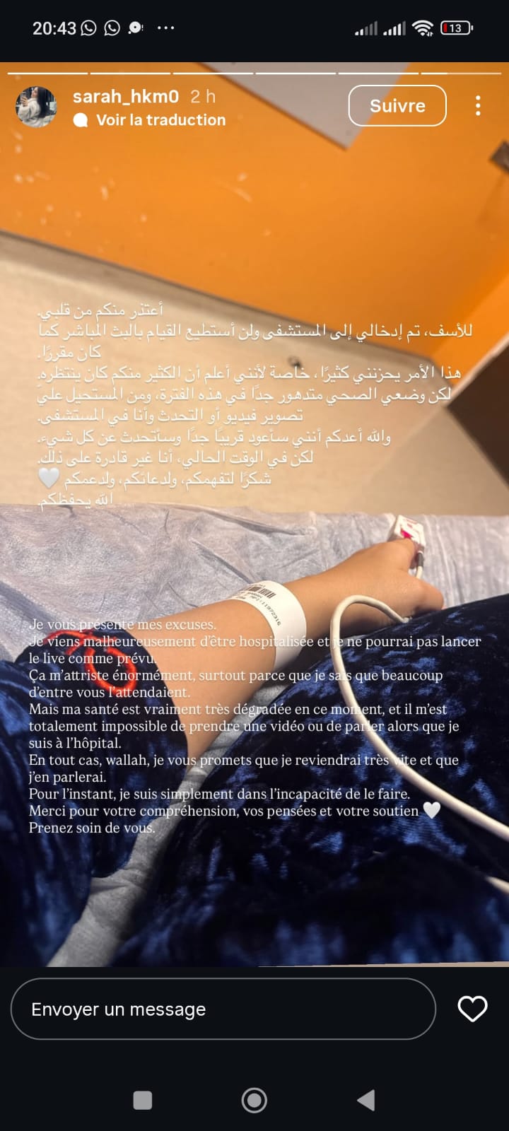 غير أن البث المباشر لم يتم في موعده، بعدما نشرت المعنية “ستوري” لاحقة أوضحت فيها أنها نقلت إلى المستعجلات بسبب وضعها الصحي، ما حال دون ظهورها كما كان مبرمجا، مكتفية بتطمين متابعيها دون تقديم توضيحات إضافية.