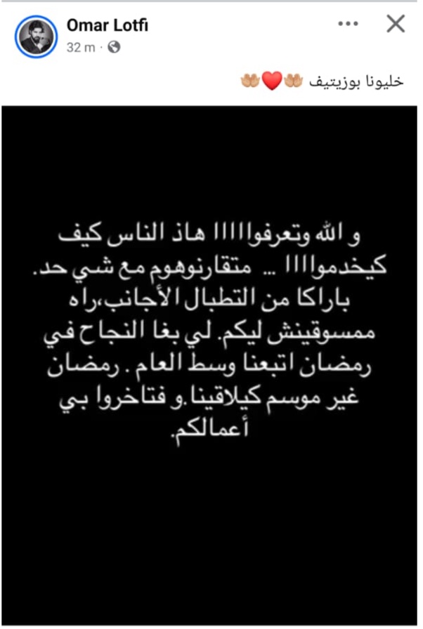 لطفي، الذي اختار بحسب بعض المتابعين أن "يسبح ضد التيار" في لحظة غضب رقمي واضح، نشر عبر صفحته الفيسبوكية رسالة مباشرة قال فيها: "والله وتعرفوا هاد الناس كيفاش كيخدمو، متقارنوهم مع شي حد، باركة من التطبال للأجانب راه ممسوقينش لكم"، وتابع قائلا: "لي بغا النجاح في رمضان يتبعنا وسط العام… رمضان غير موسم كيلاقينا.. افتخروا بأعمالكم".
