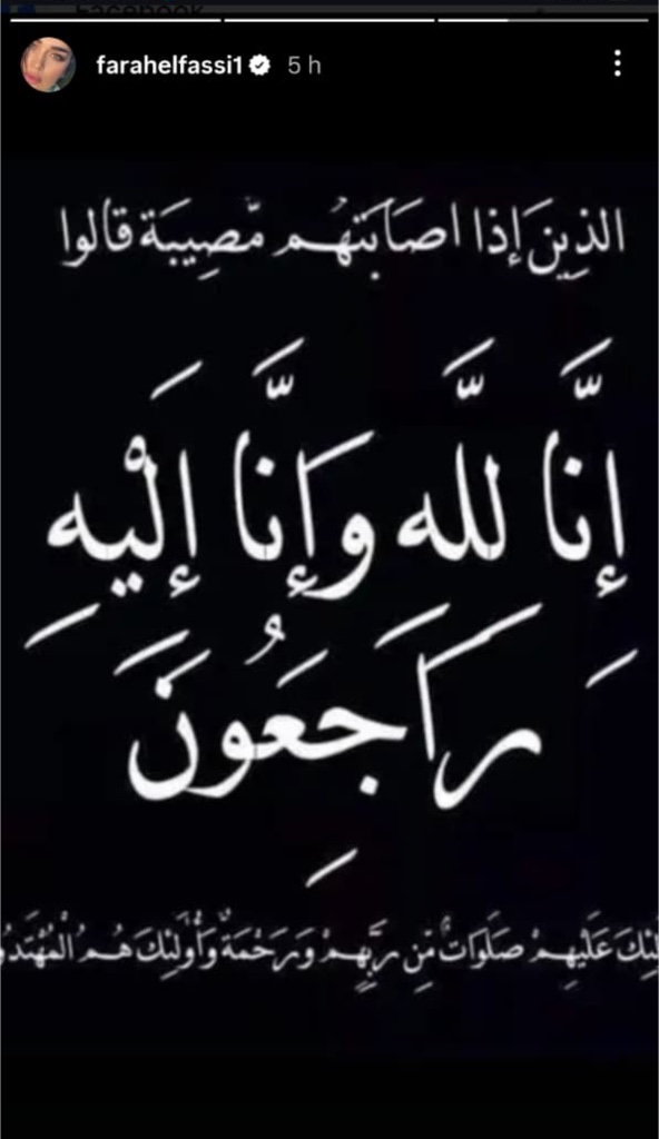 وفي موقف إنساني نبيل، بادرت الفنانة "فرح الفاسي" نشرت "ستوري" عبر حسابها على إنستغرام، عبارة عن صورة (إنا لله وإنا إليه راجعون) تعكس مشاطرتها أحزان طليقها في هذا المصاب الجلل، وهو الموقف الذي حازت على إثره احترام جمهورها، سيما بعد أن تجاوزت كل الخلافات السابقة لتقف بجانب عمر لطفي في لحظة الحزن والفقد.